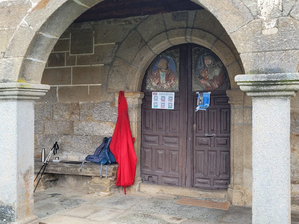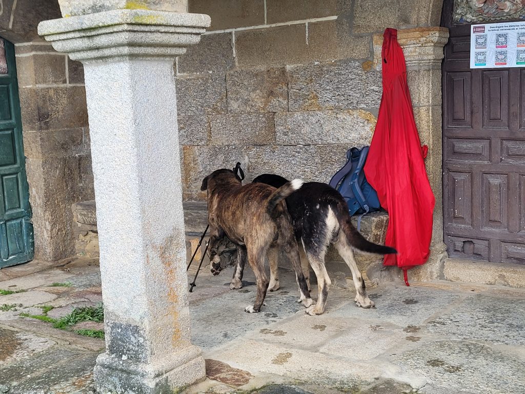 Unter den Bögen dieser kleinen freundlichen Kirche konnte ich wenigstens eine trockene Pause machen. Und bekam sogar noch Besuch von diesen freundlichen Riesen (die sich nach einigen Streicheleinheiten auch gleich noch über mein Mittagessen hermachen wollten)