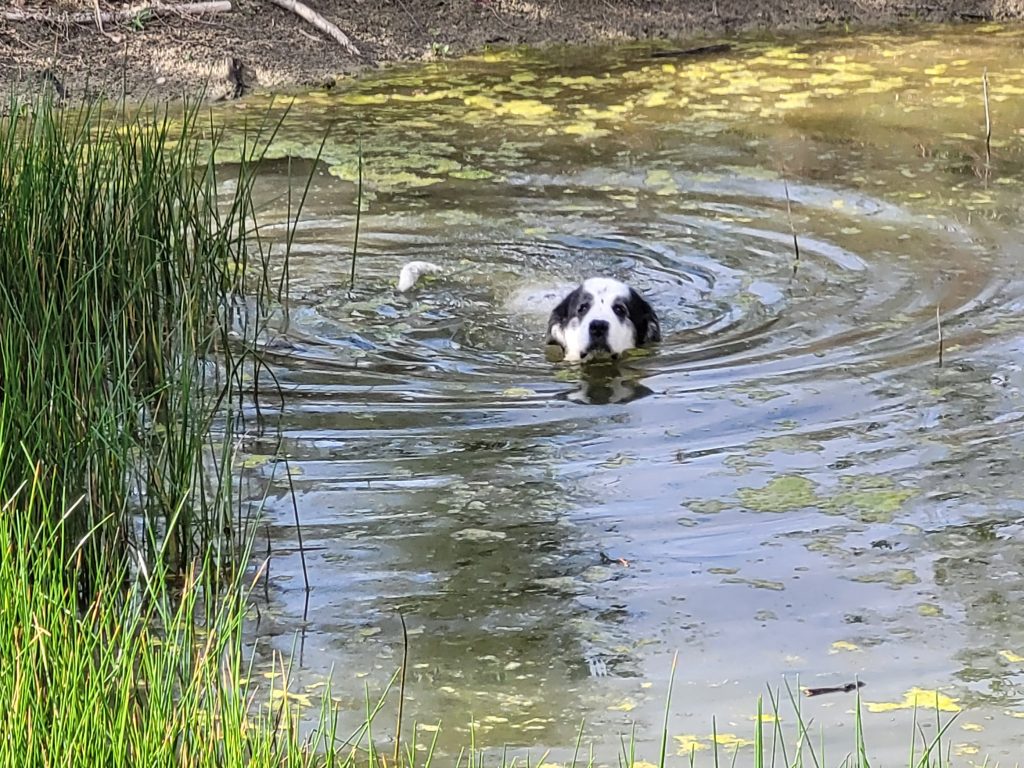 Nach etwa 8 km Auf und Ab kommen wir regelmäßig zu einem Tümpel, der von Tausenden Fröschen bevölkert ist. Das hält Thora aber in keinster Weise ab, hier ein Bad zu nehmen: