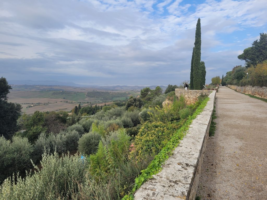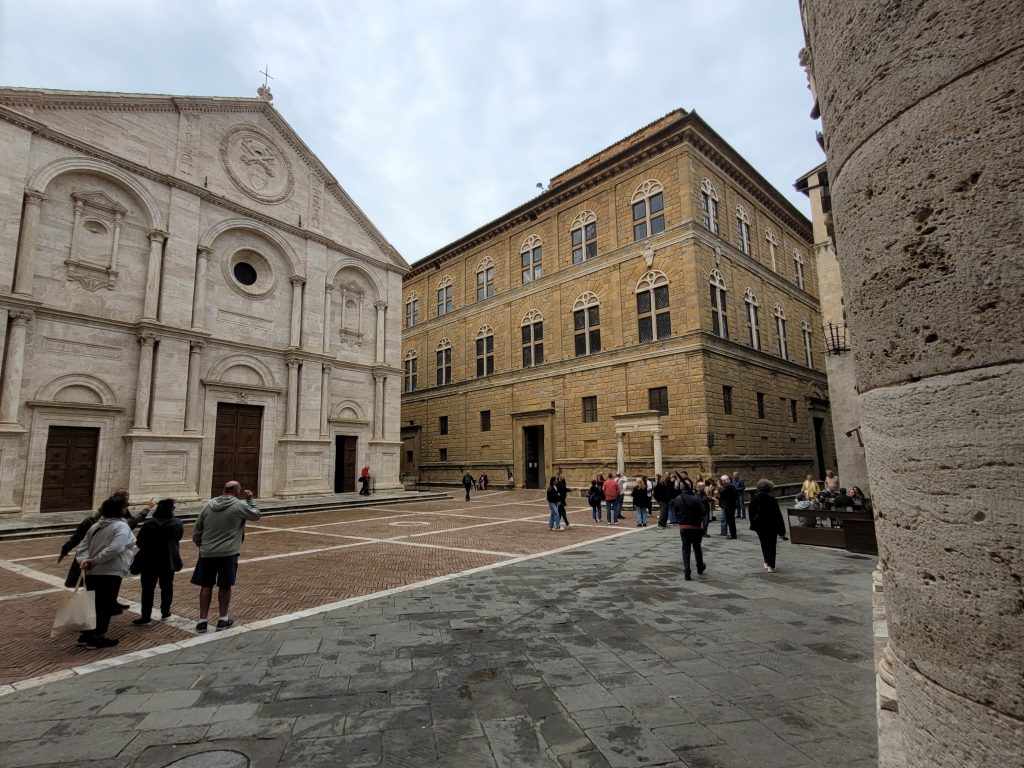 Ursprünglich hieß der Ort CORSIGNANO und hatte etwa 60 Einwohner. 1405 wurde hier Papst PIUS II. geboren. Um zu verbergen, aus welch „mickrigen Kaff“ er stammt, ließ er CORSIGNANO zur „Stadt“ausbauen: ein Florentiner Architekt baute ihm eine Kathedrale, ein Rathaus und zwei Paläste.:
