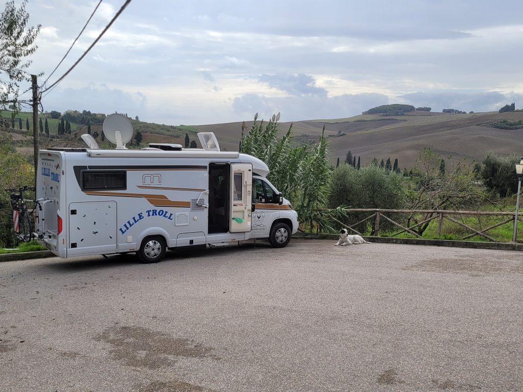 Heute Abend stehen wir in MONTICHIELLO, – in der Nähe von Mandelbäumen mit satt Mandeln: es wartet Arbeit auf uns!