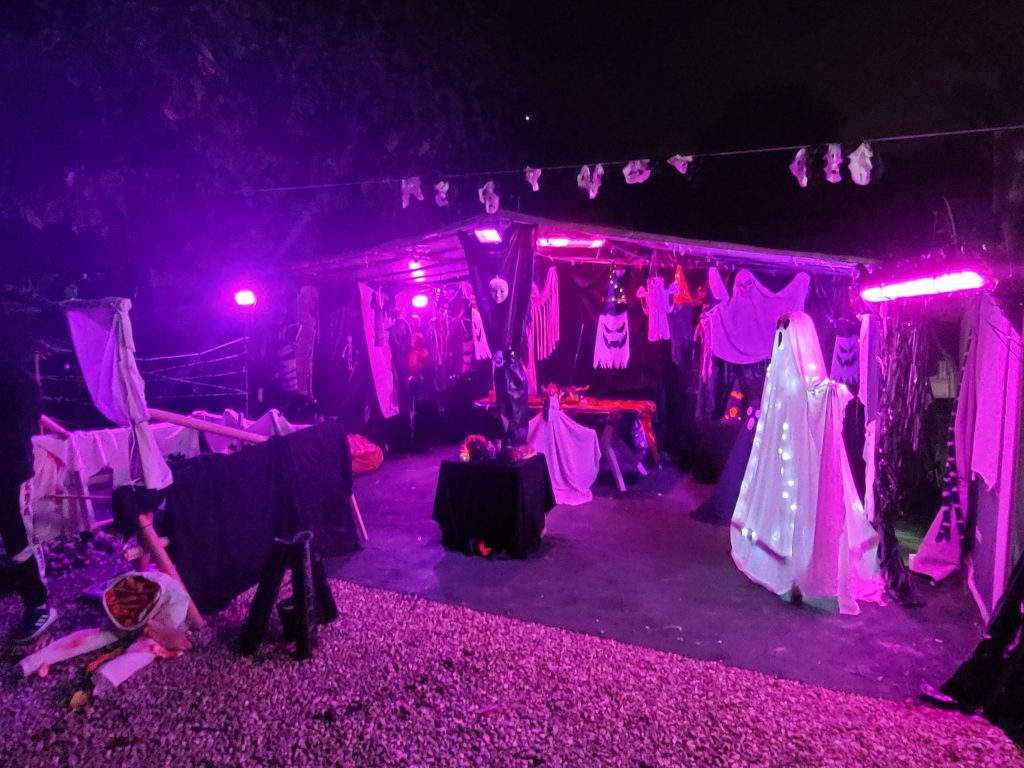 Jetzt abends gibt es auf unserem Campingplatz (wo wir ausnahmsweise – aus Sicherheitsgründen – stehen) eine große HALLOWEEN-Party. Unser Nachbar hat seit drei (!) Tagen an seiner Deko gebastelt: