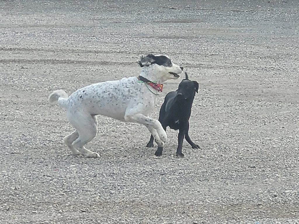 Und dann traut sich doch glatt ein freilaufender schwarzer Rüde an MICH heran: Na – dem habe ich erst einmal „Beine gemacht“. Aber der Typ blieb hartnäckig: Selbst nach weiteren zwei Mal „Prügel“ hat er nicht aufgegeben, mich zum Spielen aufzufordern.