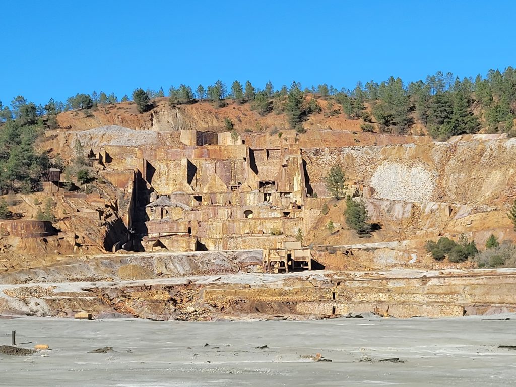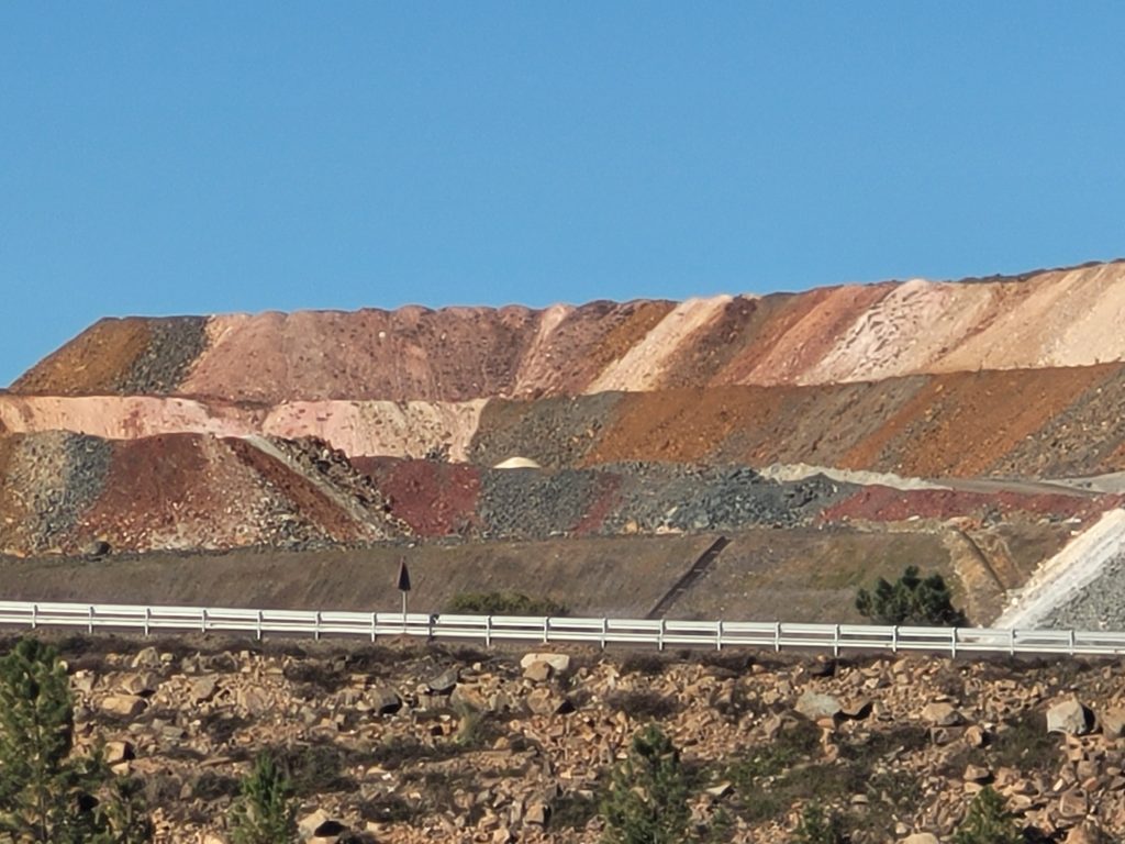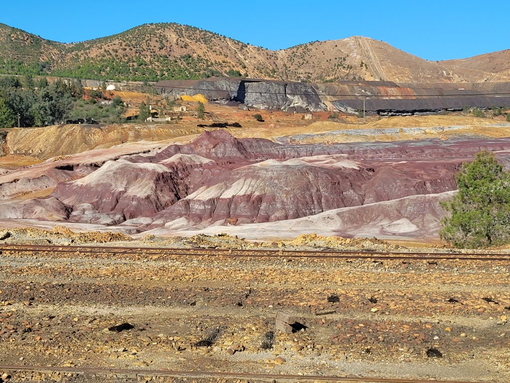 Was wir zu sehen bekamen, war faszinierend schön, aber auch gruselig. Kilometer lange Terrassen vom Tagebau, Abraumhalden in allen Farbtönen, und dazwischen der giftig-rote Fluss:
