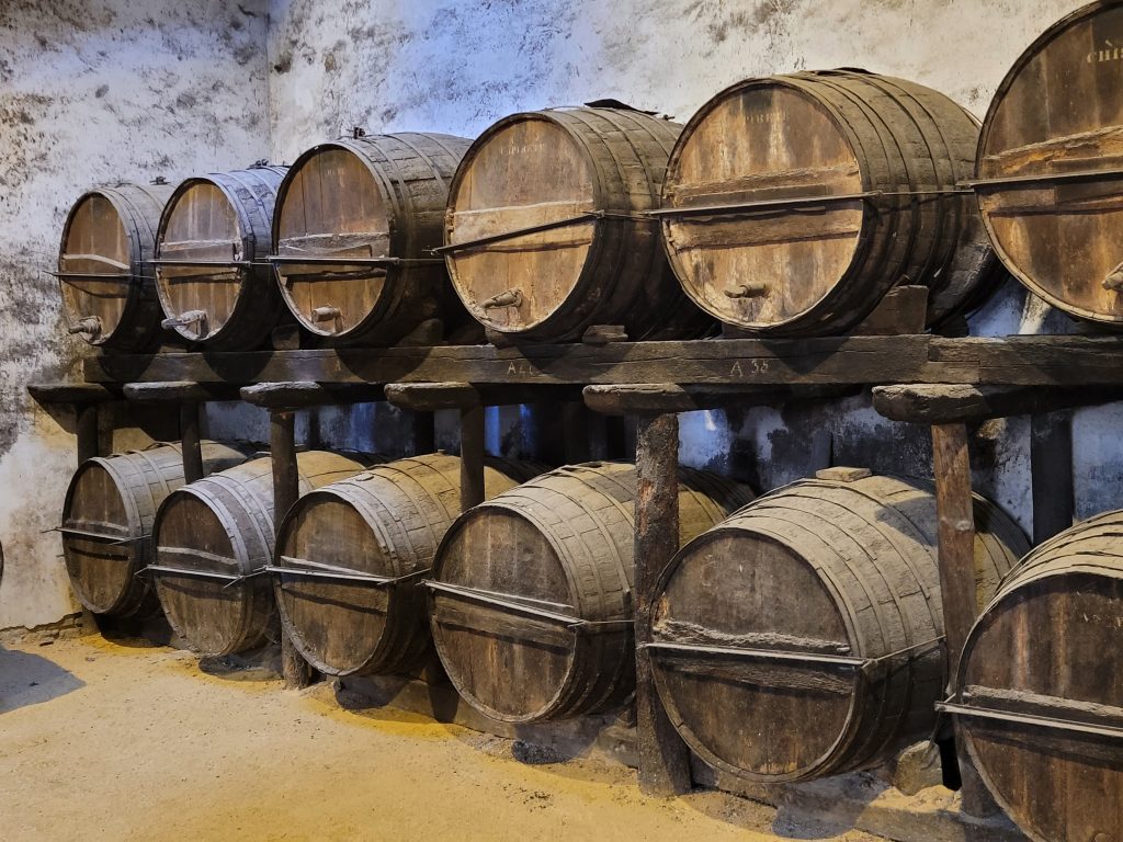 Die Herstellung ist extrem komplex: mehrere Reihen Fässer lagern übereinander. Regelmäßig wird von den oberen Reihen junger Wein in die unteren Fässer mit älterem Wein gefüllt. Ein Hefepilz („Florhefe“) sorgt für die Art der Vergärung: darf der Pilz zu 100% wirken, entsteht der „FINO„, der null Süße hat und so extrem trocken ist, dass sich einem die „Fußnägel aufrollen“.