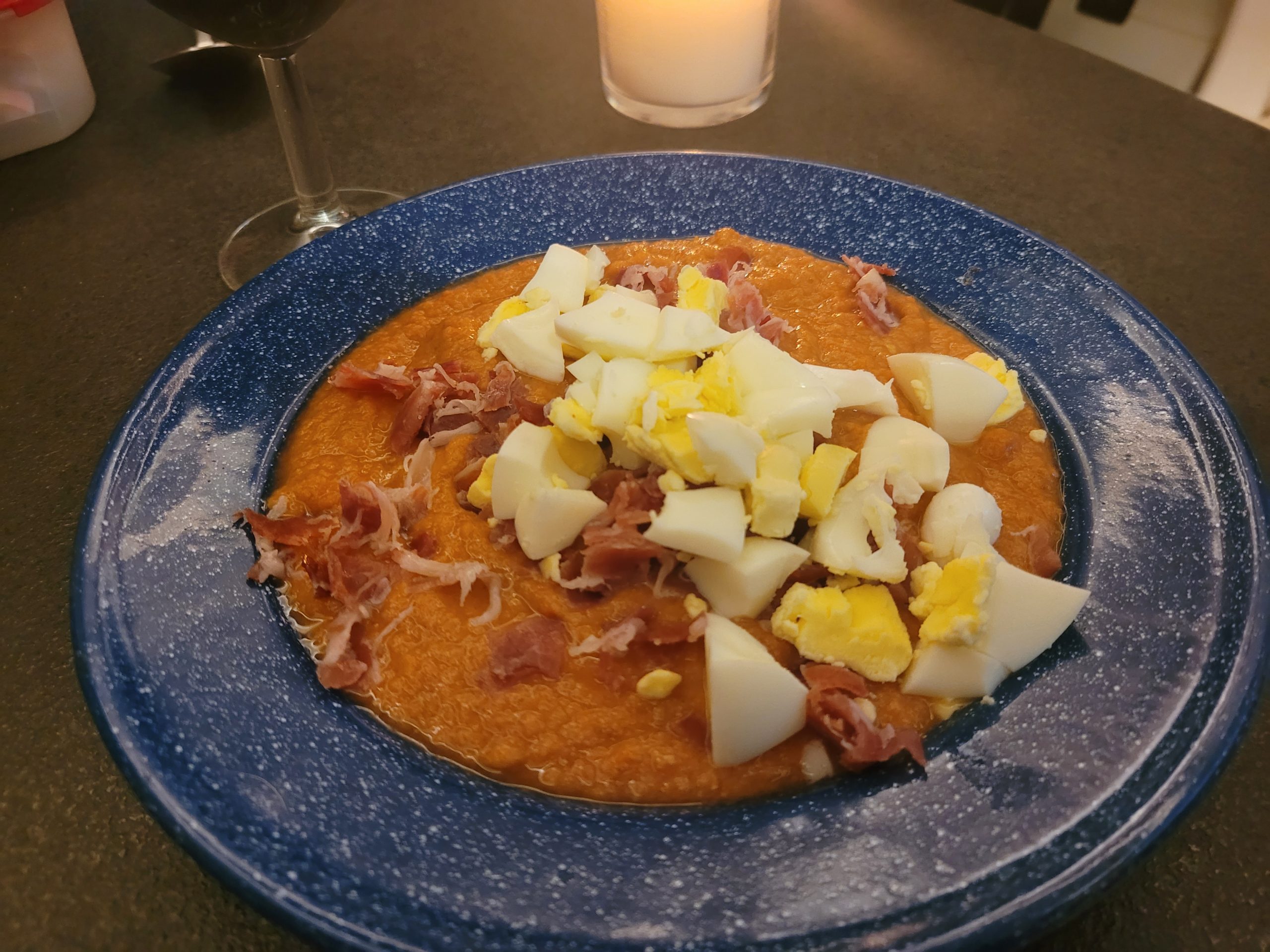 SALMOREJO ist eine dickflüssige Tomatensuppe aus der Region CORDOBA, die kalt gegessen wird. Die Tomaten werden zusammen mit Brotkrumen, Knoblauch, Salz und Olivenöl püriert. Zuletzt gibt man hartgekochte Eier, Serrano-Schinken und Olivenöl über die Suppe. KÖSTLICH!!!