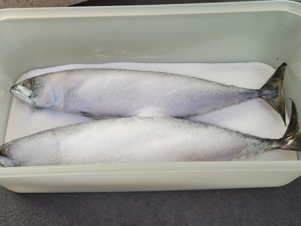 Im ersten Schritt werden die sauberen Fische mit Salz getrocknet. Entweder 12 Stunden in Salz-Lake oder zwei Stunden in reinem Salz: