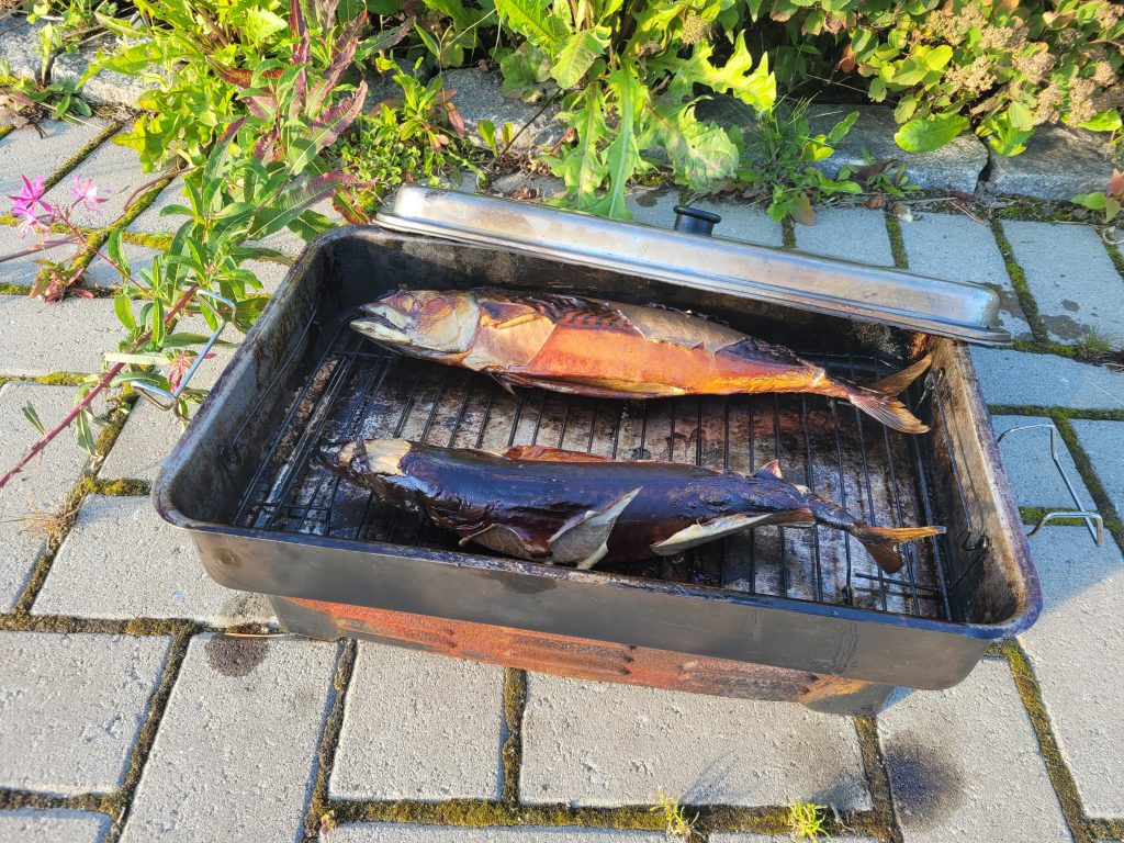 Am liebsten räuchern wir die Fische, die wir fangen. Zuhause haben wir einen Gas-betriebenen, hohen Räucherofen, in den auch lange Fische wie z.B. Aale und Hornhechte passen.