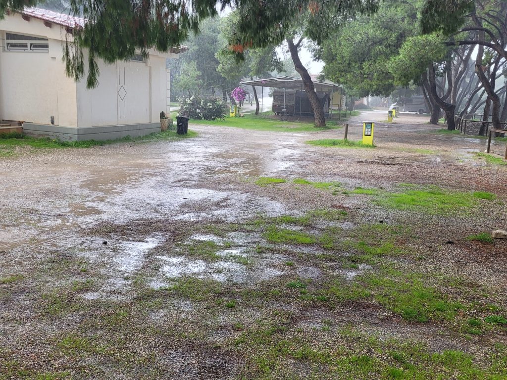 Bereits von Anfang an haben wir unsere Markise aufgespannt – nicht etwa gegen Sonne, sondern um gegen das wechselhafte Wetter gewappnet zu sein (Campingstühle, Wäsche, Schuhe):