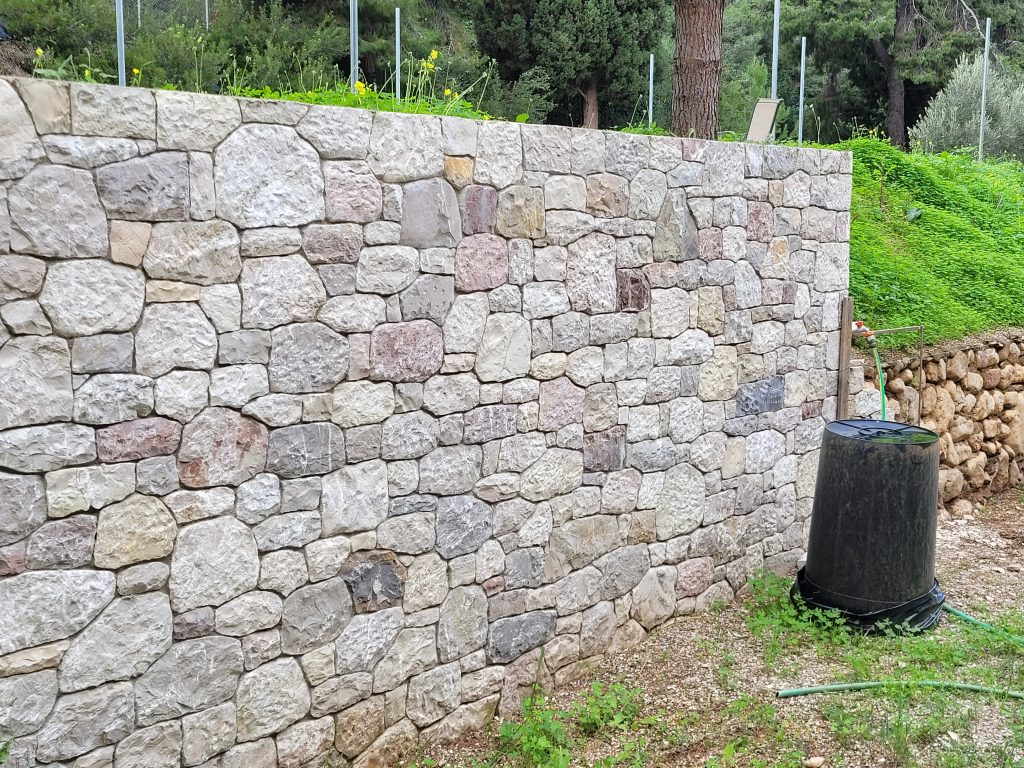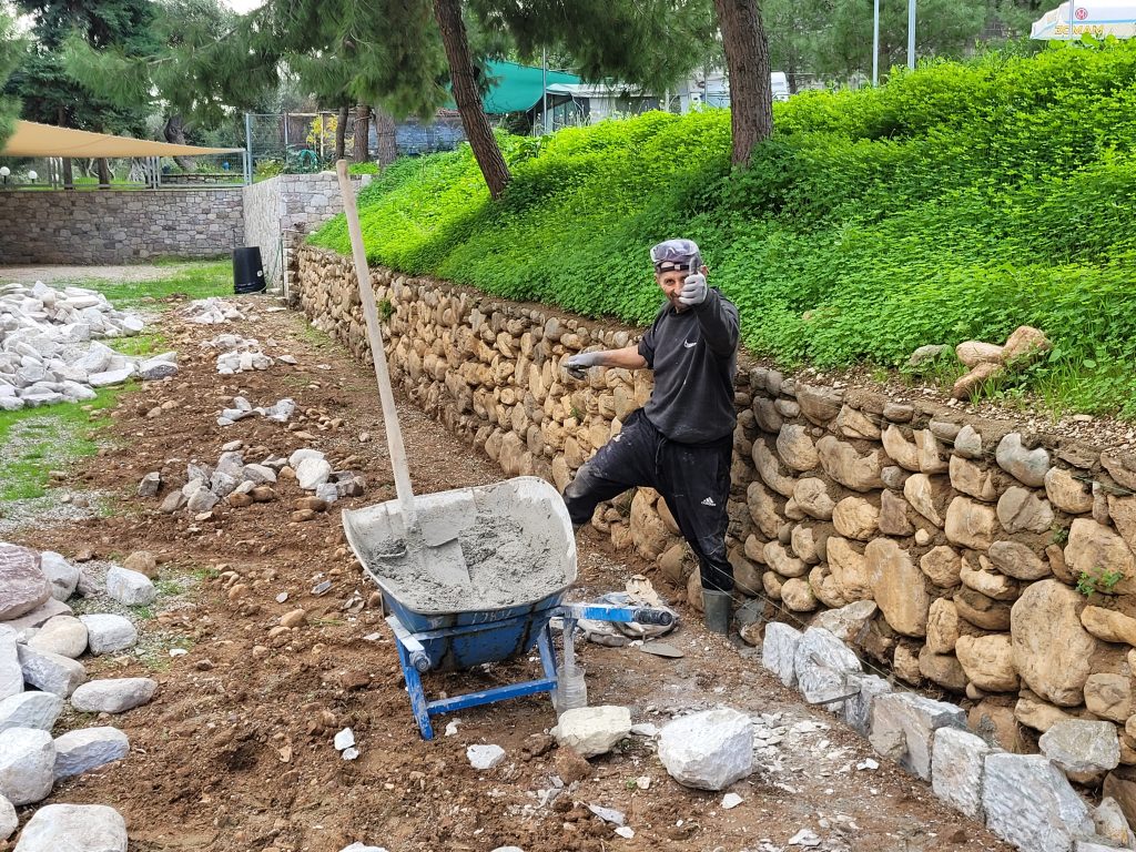 Seit wir hier auf dem Platz stehen, begleitet uns tagsüber das beständige Klopfen und Hämmern eines Steinmetzes, der eine neue Natursteinmauer baut: