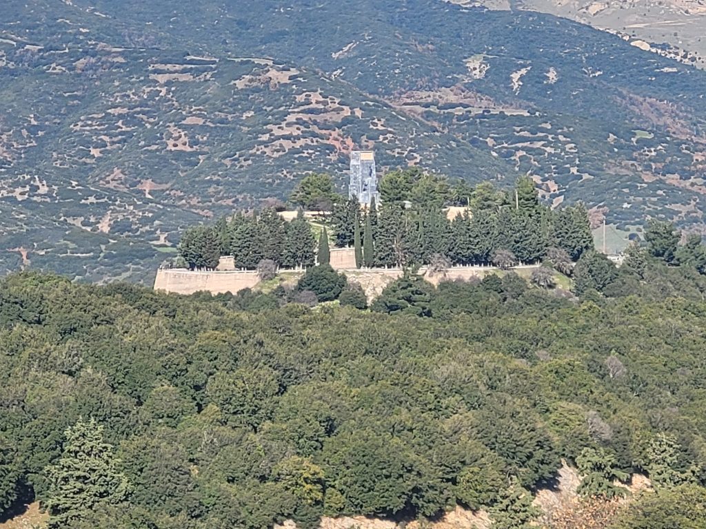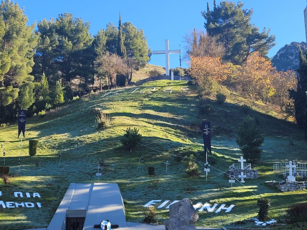 Es ist herrlich ruhig, hat einen super Blick auf die Berge und die nationale Gedenkstätte für die griechischen Partisanen: