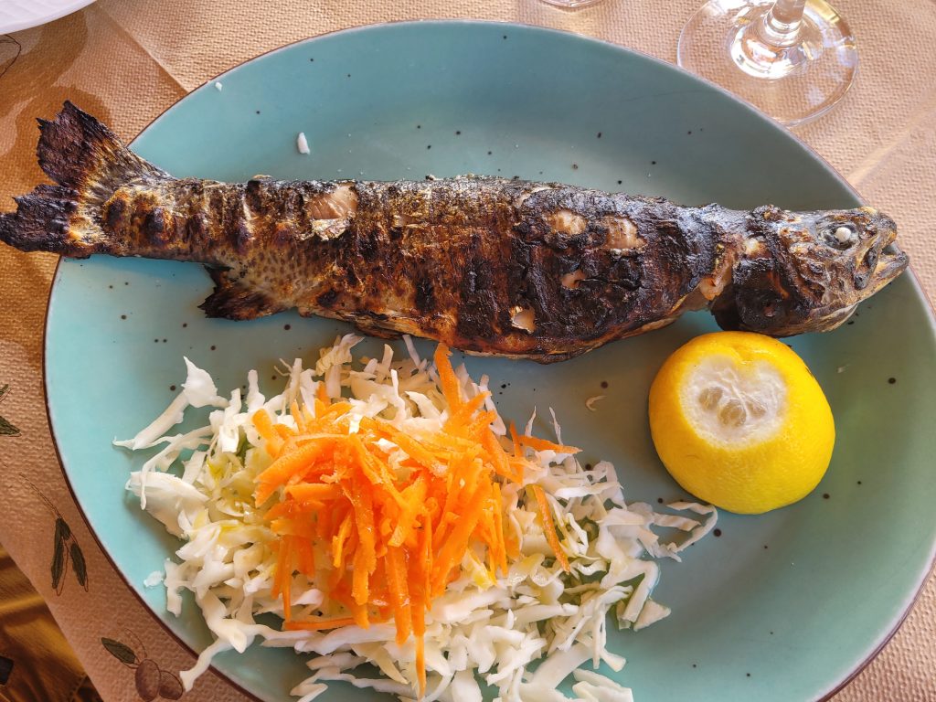 Mittags haben wir ein Gebirgstal besucht, wo ein munterer klarer Bach mehrere Becken speist, wo die lokalen Bauern Forellen und Lachse züchten. Klar, woraus unser Mittagessen bestand: