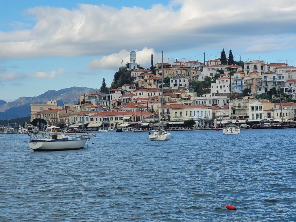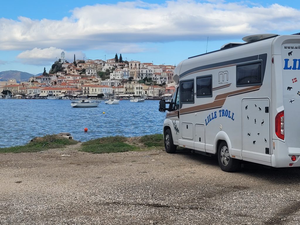 Ein Übernachtungsplatz ganz nach unserem Geschmack: ein großer Schotterparkplatz, legal und kostenlos – mit einem super Blick auf die gegenüberliegende Hauptstadt der kleinen Insel POROS.