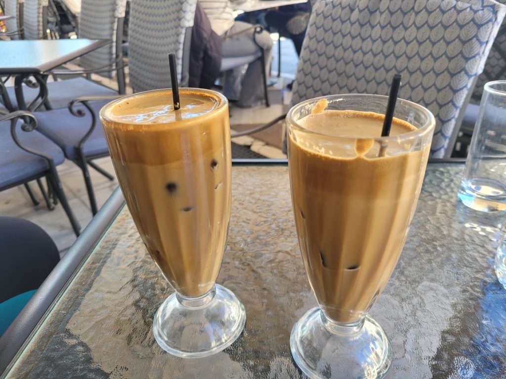 Völlig atypisch für einen Weihnachtsmarkt-Besuch haben wir dann einen typisch griechischen „Frappè“ getrunken – einen Nescafe mit Eiswürfeln: