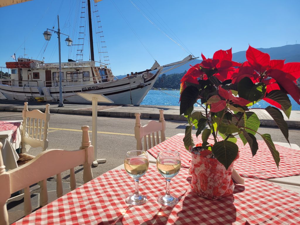 Unser (nachgeholtes) Weihnachtsessen bestand dann aus einem griechischen Grillteller mit einem guten Moschofilero – bei herrlichstem „Weihnachtswetter“: