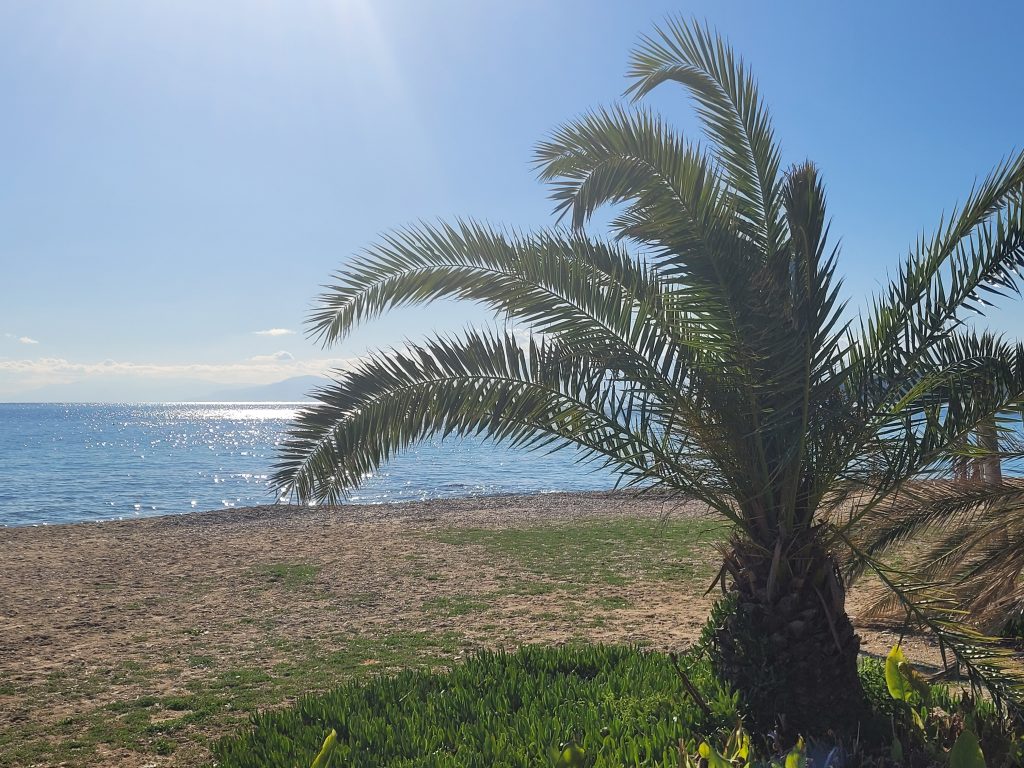 Gestern, an Silvester, hatten wir Dauerregen. Heute scheint wieder die Sonne und der Himmel ist blau. Allerdings geht die Temperatur nachts auf 1° runter, und tagsüber bleibt sie im Schatten einstellig. Die Griechen sind winterlich gekleidet.