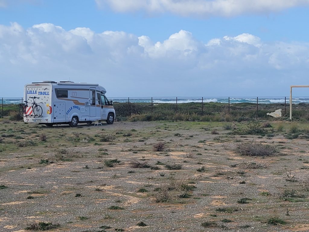 Wir haben zwar kein Schnee und Eis, dafür aber heftigen Sturm und Orkanböen. Zeitweilig können wir unsere Tür nicht öffnen, und die Sat-Schüssel ließ sich nicht mehr einfahren. An ein Weiterfahren ist unter diesen Umständen nicht zu denken.