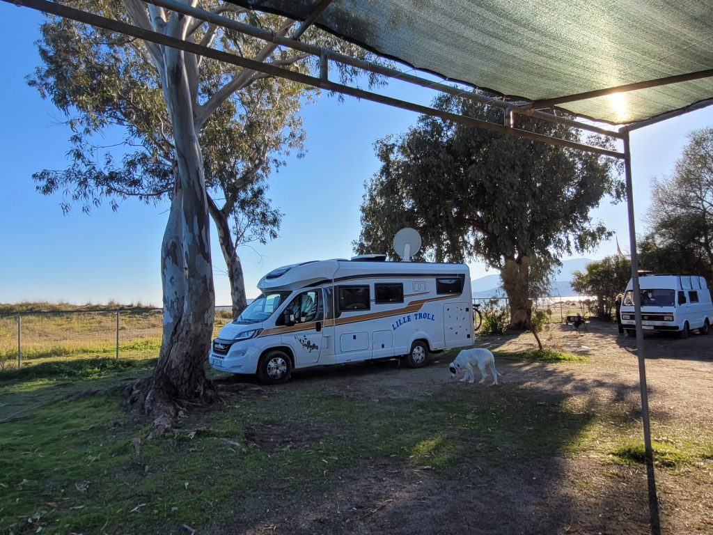 Nach einer Woche in der „freien Wildbahn“ (kein offizieller Stellplatz, kein geöffneter Campingplatz, keine vernünftige Ver- und Entsorgung, keine externe Stromversorgung) stehen wir mal wieder auf einem Campingplatz. Nach einer eisigen Nacht mit -3° konnten wir sogar einen Platz „in der ersten Reihe“ ergattern.