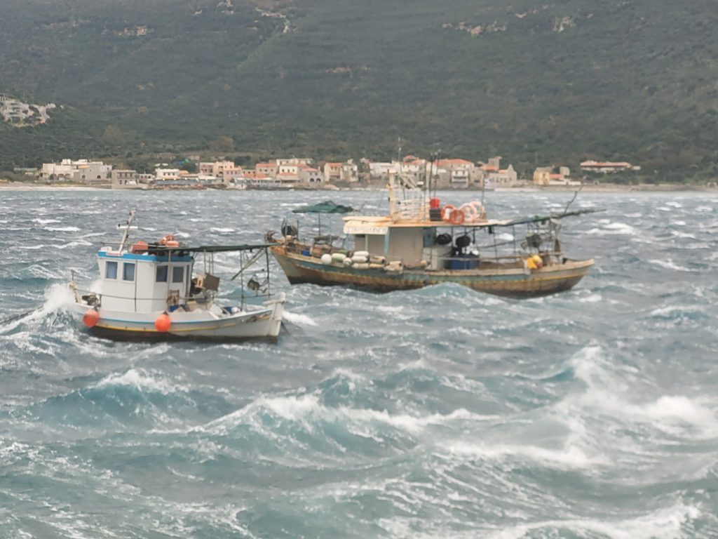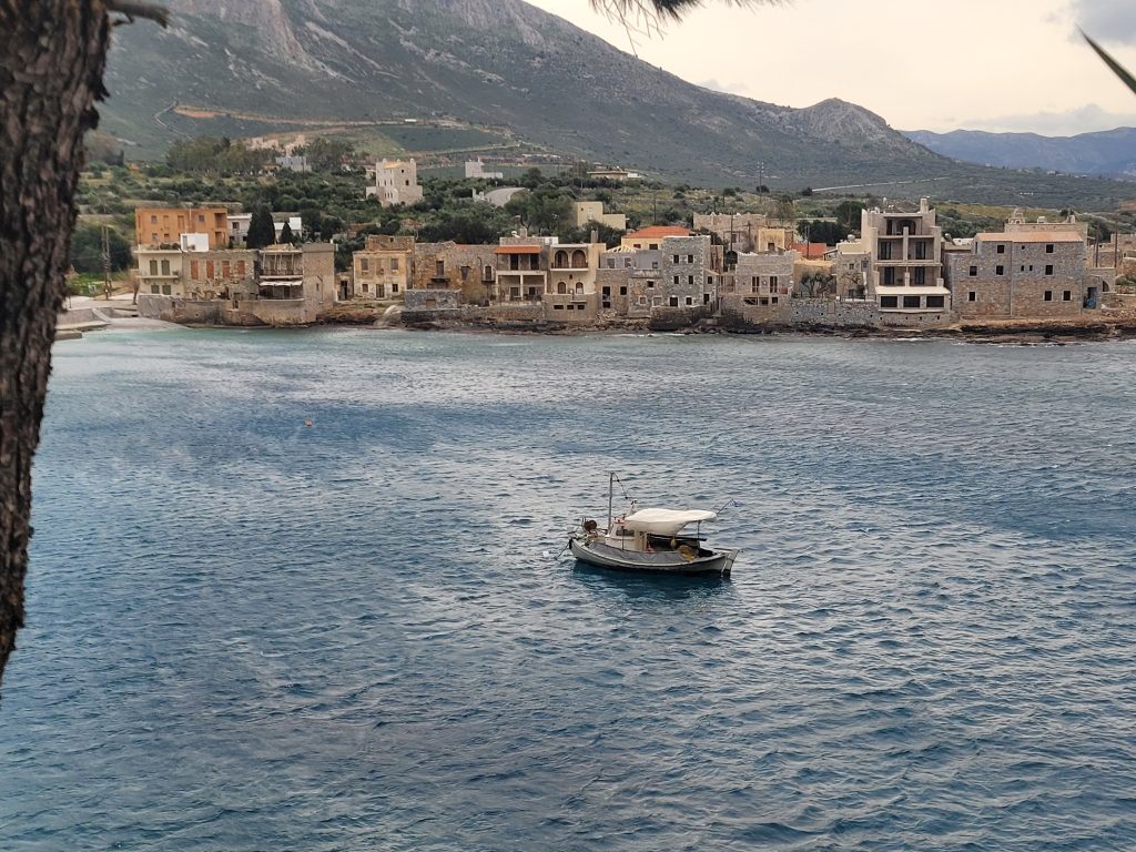 Da wir die Situation auf unseren „Bergplatz“ nach der Begegnung mit den Manioten als zu bedrohlich empfunden haben, sind wir auf einen Parkplatz in GEROLIMENAS gefahren. In der Nacht wurde der Sturm dermaßen heftig, dass die Sat-Schüssel ständig auf das Dach hämmerte – wir mussten das WoMo umdrehen. In der halbswegs geschützten Bucht sah das Fischerdorf am Morgen dann so aus: