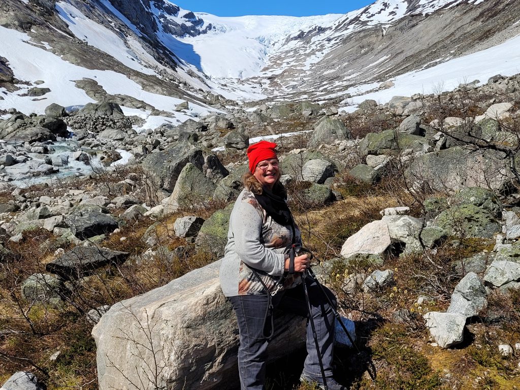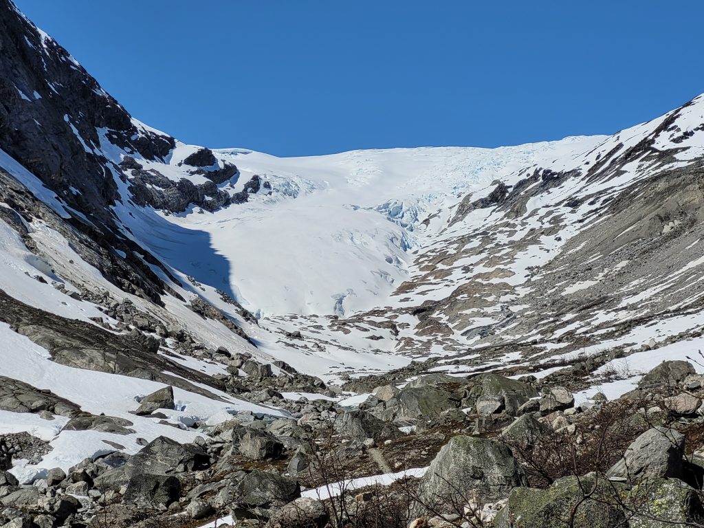 Trotz meiner Knieschmerzen habe ich die Zähne zusammengebissen und bin zum FABERGSTOLSBREEN gehumpelt. Diesen „unseren“ Gletscher musste ich um alles in der Welt wieder mit eigenen Augen sehen!