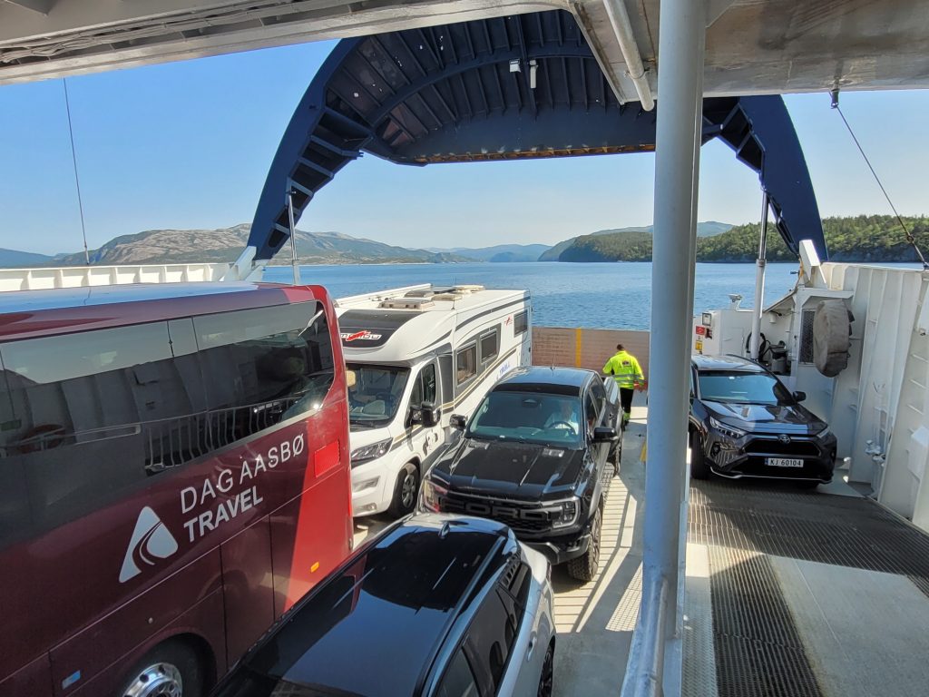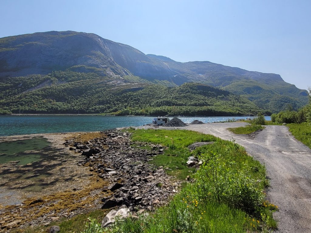 Mindestens fünf Inseln über drei Brücken und zwei Fähren … dazwischen eine kleine, aber wenig befahrene Straße. Und am Nachmittag fand sich ein schöner Stellplatz am Fjord.