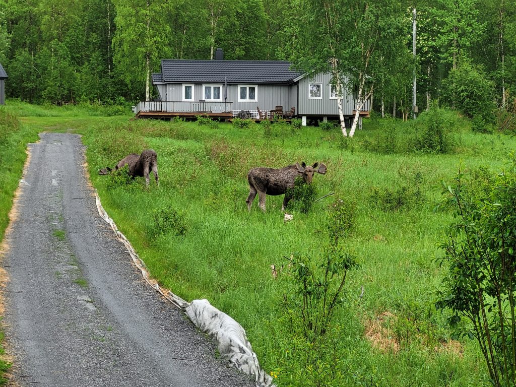 Friedlich grasend, vor einem Wohnhaus, keine 30 Meter neben der E 6 … zwei (nasse) „Könige des Nordens“! Während all unserer Nordlandfahrten in den letzten 30 Jahren haben wir bisher nicht mehr als an die 15 Elche in freier Wildbahn erlebt (noch schwieriger ist das Fotografieren).