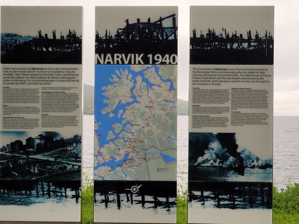 Jetzt übernachten wir an dem Platz, an dem am 08. April 1940 zehn deutsche Zerstörer mit 2000 Gebirgsjägern an Bord im Fjord einliefen, um den brutalen Überfall auf Narvik zu starten. Interessant: hier holte sich die Wehrmacht die erste blutige Niederlage im 2. Weltkrieg!