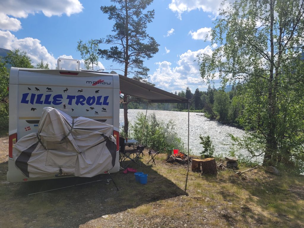 Dabei haben wir einen traumhaft schönen Platz in DIVIDAL gefunden, fast schon an der schwedischen Grenze. Meine Lieblingsbeschäftigung, nämlich Forellen angeln in Gebirgsflüssen, hat hier in Norwegen leider erneut einen Dämpfer bekommen: nach zwei Stunden nicht ein einziger Anbiss! Schaun wir mal, was in den nächsten Wochen noch kommt!