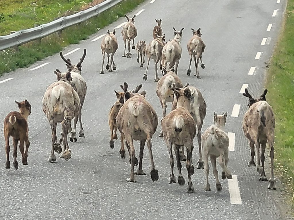 Auch zwei schöne Tierkontakte hatten wir gestern: nachmittags besuchte uns eine Gruppe von sechs Schweinswalen (habe ich leider kein Foto machen können), und auf der Straße begegneten uns diese Ureinwohner: