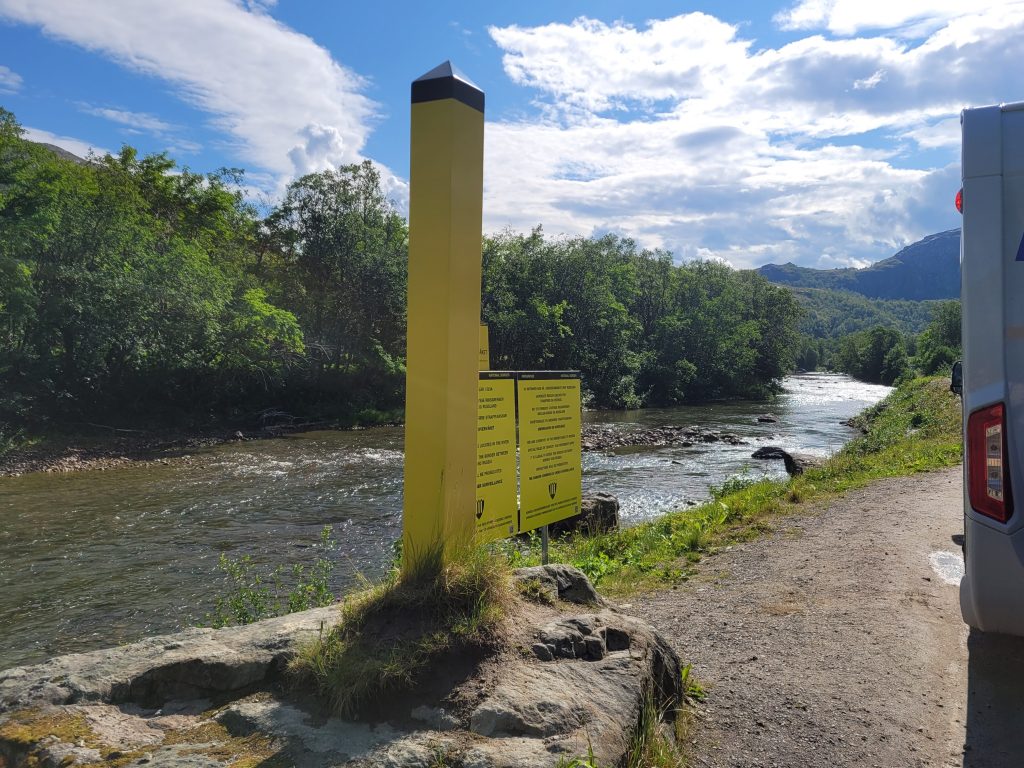 In diesem flachen Fluss tummeln sich Tausende von (Buckel-)Lachsen, man hätte sie mit dem Netz fangen können – aber erstens ist das Angeln für Nicht-Norweger verboten und zweitens hätte ein Meter zu weit in den russischen Teil des Flusses Verhaftung bedeuten können (obwohl wir keine russischen Grenzer gesehen haben)!