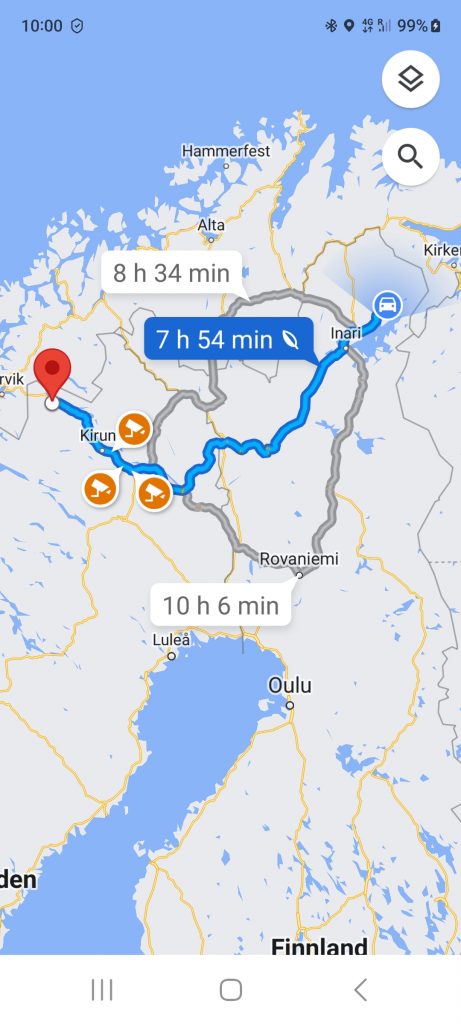 Jetzt haben wir über 600 km Fahrstrecke vor uns bis nach ABISKO in Schweden, wo der Kungsleden beginnt.