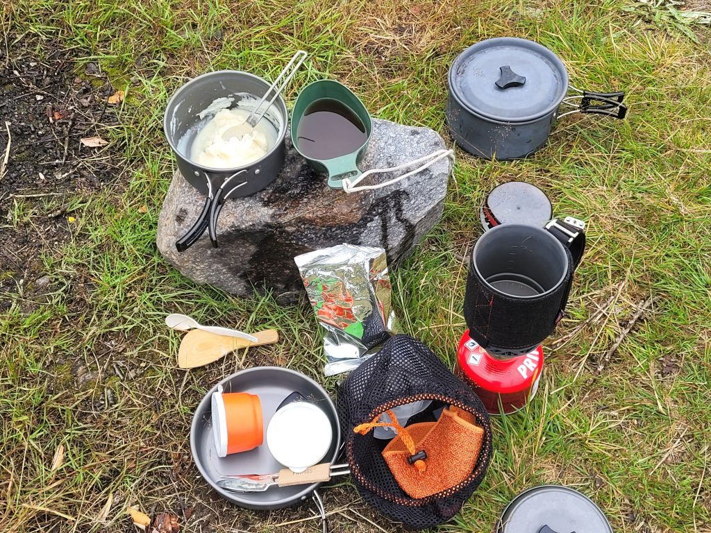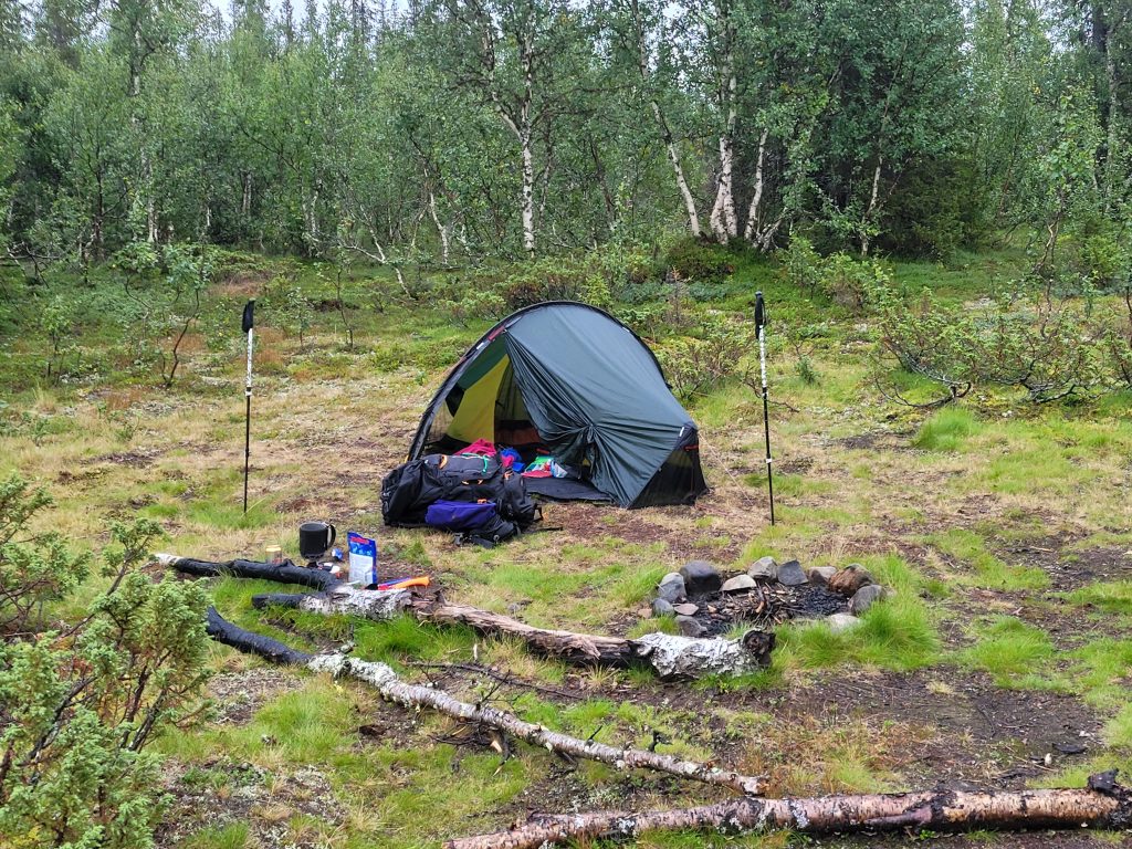 Und ein Wunder: fünf Minuten später hört es auf zu regnen, ich finde eine Waldlichtung zum Aufbau meines Zelts, bereite mein Abendessen zu, – und kaum klettere ich in meinen Schlafsack, prasselt der Regen wieder los!