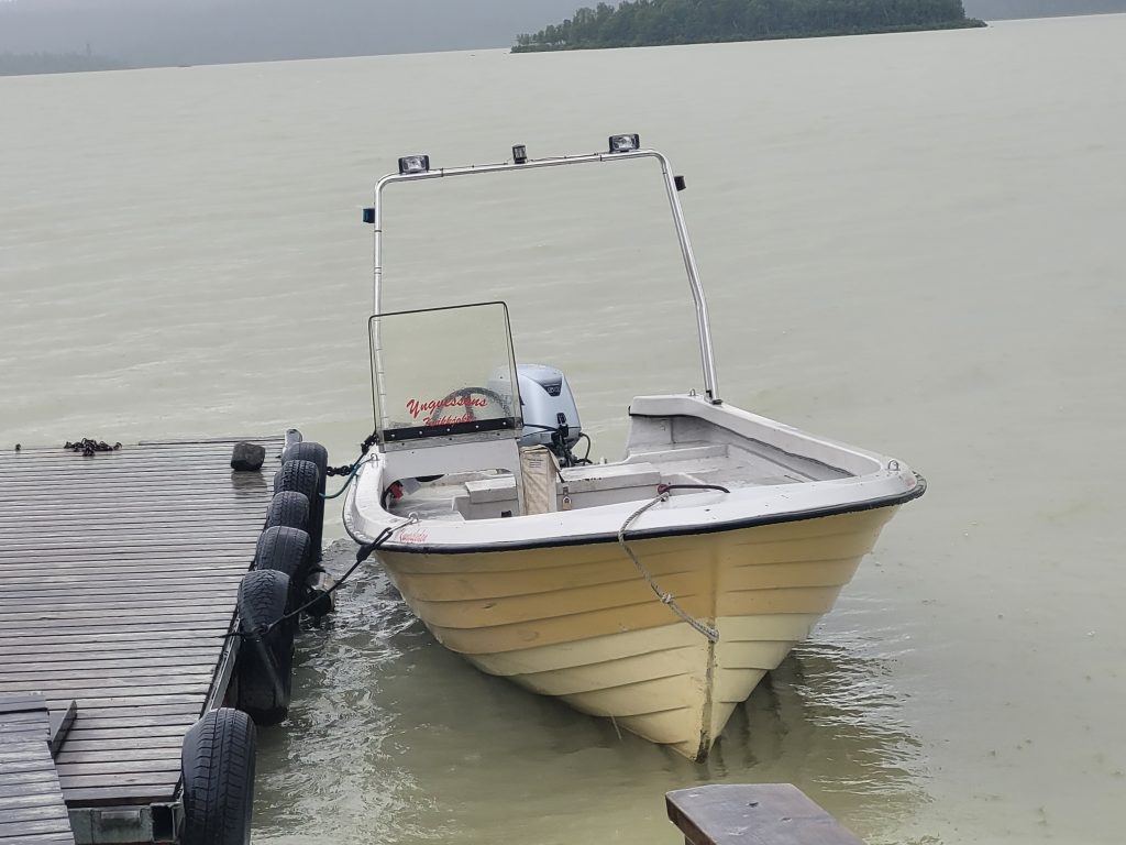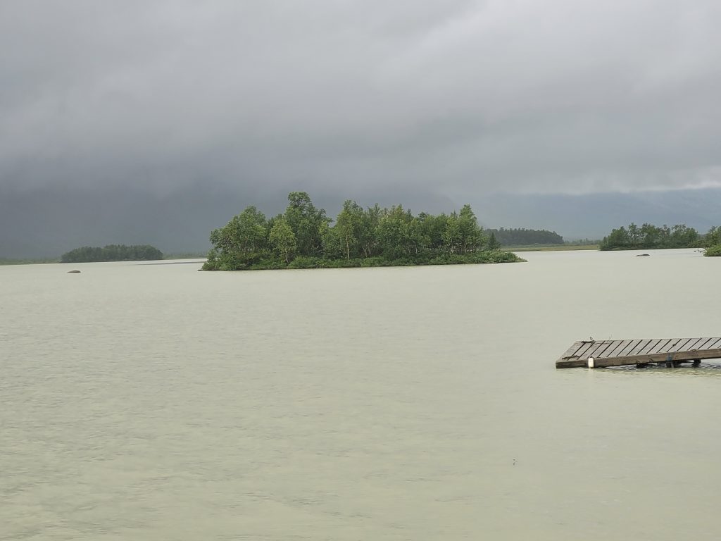 Daher mache ich weiter, warte auf das Motorboot, und wandere noch 5 km im strömenden Regen weiter.